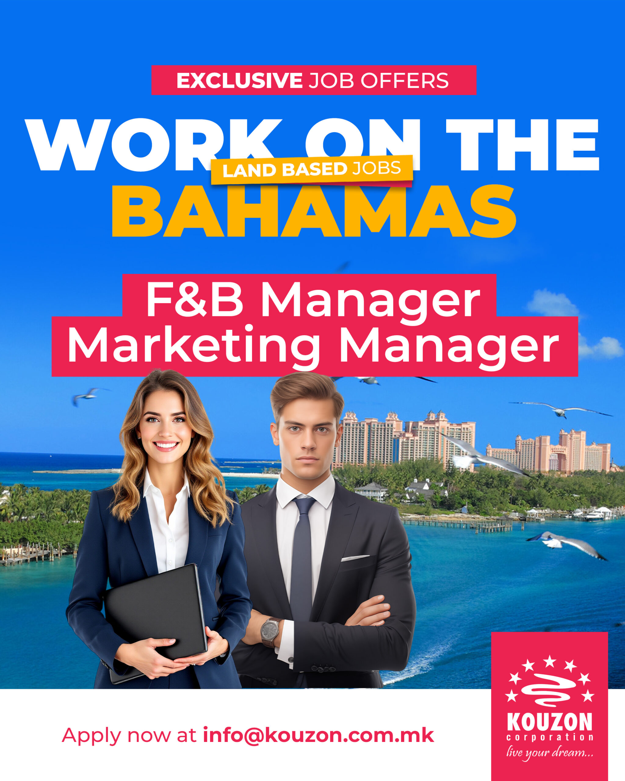 WORK WHERE OTHERS VACATION – IN THE BAHAMAS! Kouzon is hiring for exclusive land-based positions in one of the most beautiful places on Earth! ONLY with KOUZON