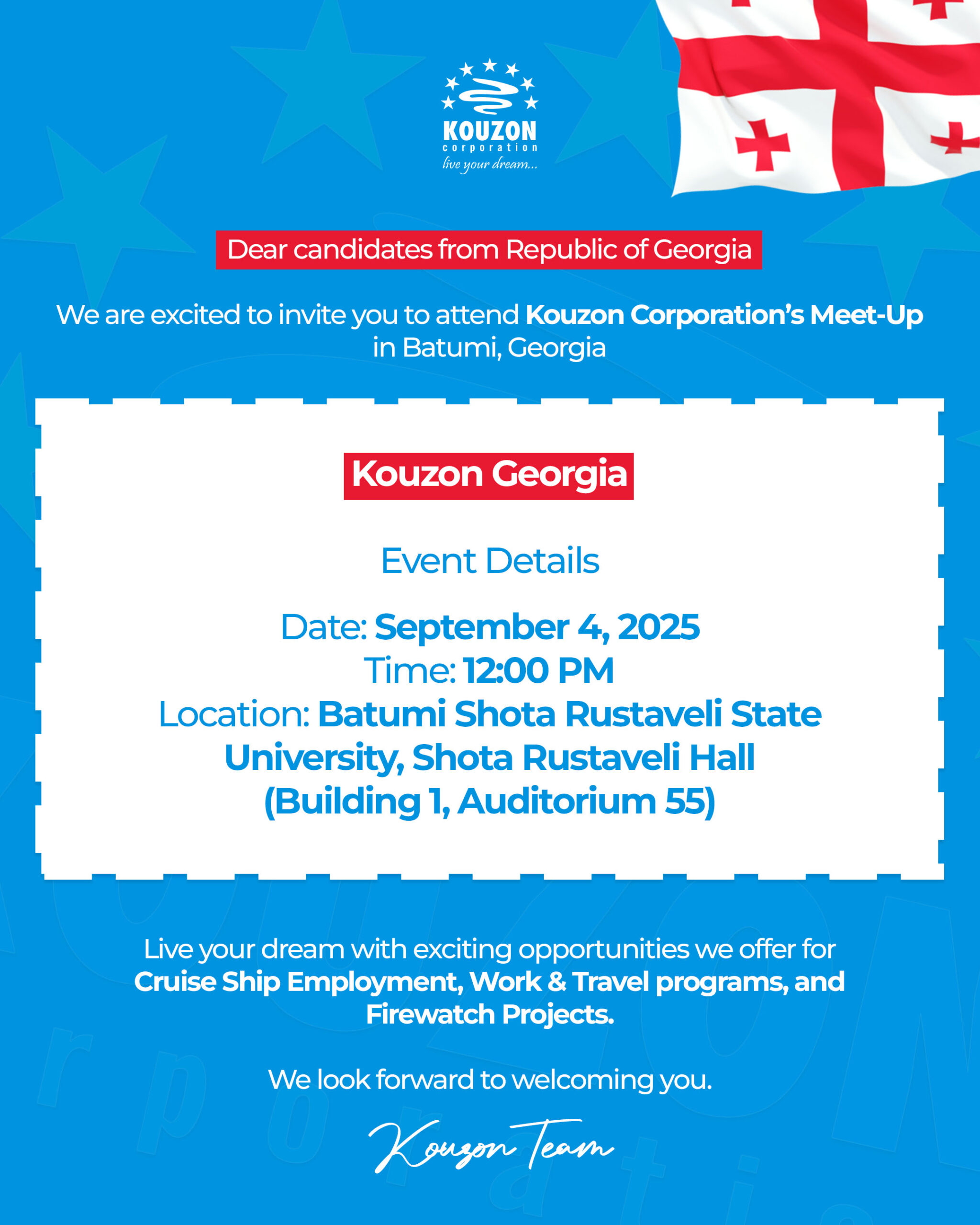 Join Kouzon Corporation for an exclusive presentation in Batumi where we will share exciting opportunities for individuals who want to work, travel, and build a